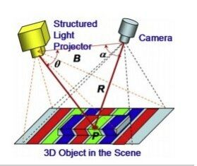 Чтобы преодолеть недостатки стереоскопического метода, можно заменить одну из камер стереопары проектором и получить устройство регистрации трехмерных объектов, основанное на активном параллаксном принципе. Схема системы, построенной на данном принципе, показана на рисунке 2: на объект проецируется некоторая картина (структурированная подсветка), ее искажения, вызванные формой объекта, регистрируются камерой [3, 4].