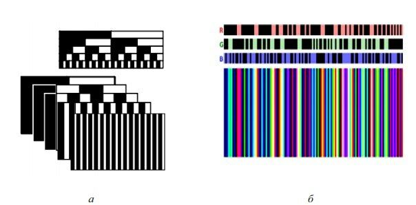 В настоящее время разработано множество различных вариантов картин для использования в системах структурированной подсветки, представляющих собой как серии изменяющихся картин (картины с временным мультиплексированием), так и неизменные картины с использованием различных вариантов цветовой кодировки [3, 4]. Временная кодировка использует последовательность черно-белых картин, как показано на рисунке 3, а. Идея этого метода состоит в том, чтобы кодировать положение пикселя на матрице проектора набором интенсивностей в последовательности проецируемых картин. Набор картин, показанный на Рисунке 3, а, использует «битовое» кодирование: набор двухцветных (черно-белых) картин представляет собой двоичный код, определяющий «номер» пикселя в строке. Помимо «битового» кодирования также используются другие методы двоичного кодирования (сдвиг бинарной картины, код Грея и другие [3, 4]). Такой способ не чувствителен к цвету поверхности, позволяет кодировать каждый пиксель на матрице проектора, однако требует статичности положения объекта из-за большого количества используемых картин.