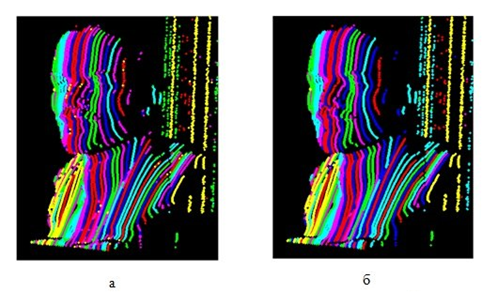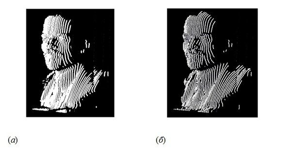 Для оценки зависимости результатов детекции полос от используемого метода (прямой метод поиска локальных максимумов или метод Канни) использовались те же изображения. Количественная оценка в данном случае возможна только для объекта «Плоскость», поскольку для него можно определить «истинное» количество точек центров полос как произведение количества полос на количество строк изображения. Для обоих методов при детекции полос на плоском объекте по V был получен одинаковый максимальный результат. Для объекта «Бюст» возможно проведение качественной оценки, результаты детекции полос приведены на рисунке 7. Видно, что метод Канни позволяет детектировать больше точек локальных максимумов при том же пороговом значении за счет использования «сильного» и «слабого» порогов, однако это преимущество незначительно.