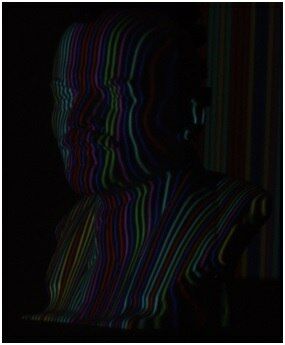 Алгоритмы выделения полос для различных картин подсветки с цветовым кодированием можно разделить на два типа: с выделением краев (edges) и с выделением пиков (peaks). Используемая картина подсветки содержит промежутки черного цвета и требует использования алгоритма второго типа. Для выделения полос на изображении можно использовать прямой метод поиска локальных максимумов, метод пересечения нулевой линии второй производной (детектор лаплассиана гауссиана (LoG)) или метод Канни (Canny) [6]. Зарегистрированное изображение содержит три цветовых канала (R,G,B), поэтому для применения вышеупомянутых методов требуется или преобразование к одному каналу с использованием его для обработки, или объединение результатов выделения полос по нескольким каналам. После первичного выделения центров полос данными методами обычно производится субпиксельное уточнение координат максимумов или с использованием интерполяции параболой [7], или определением центра тяжести по нормализованным значениям в окрестности.