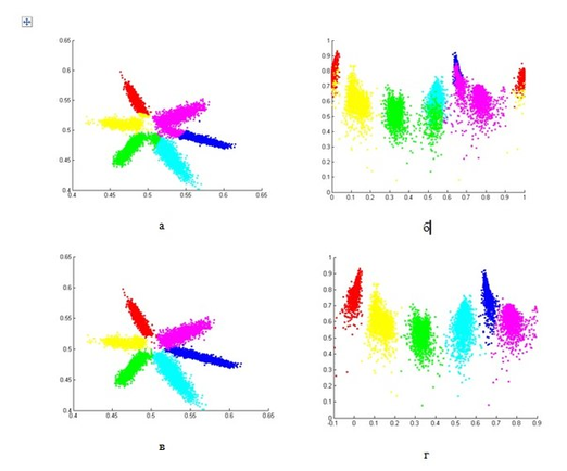 Также на рисунках 10, б, г можно заметить множество, которые нельзя с уверенностью отнести к какому-либо из кластеров. Вводя пороговое значение по насыщенности S или по расстоянию до центра кластера можно выделить данные точки в кластер «неклассифицированных».