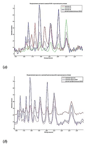 Для выбора оптимального цветового преобразования для выделения максимумов был проведен анализ сечений изображений, зарегистрированных в ходе проведения экспериментов, и оценена пригодность использования различных величин с точки зрения выбора надежных пороговых значений алгоритма. В работе [7] были показаны значения различных величин: цветовых каналов R, G и B, среднего арифметического по трем данным каналам, яркостной составляющей (Y) после преобразования в YCbCr и значения цвета (V) после преобразования в HSV в сечении изображения объекта, перпендикулярном направлению проецируемых полос. Также, в работе [7] был сделан вывод, что при использовании линейной комбинации цветов (R+G+B) чистые цвета сильно подавляются, и могут быть пропущены. По результатам анализа можно сделать вывод, что наиболее стабильную детекцию центров полос можно получить, используя значение цвета V.