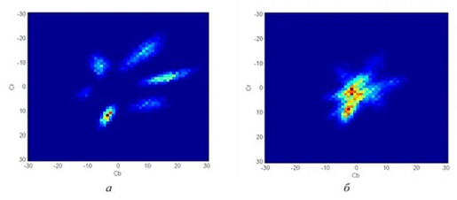 Принадлежность точки к кластеру показана цветом, расположение точек соответствует их координатам в плоскости CbCr (рисунок 10, а) и в плоскости HS (рисунок 10, б). Из рисунков видно, что алгоритм классифицирует множество точек с низким значением насыщенности S. Причиной этой ошибки является метод расчета расстояния от точки до центра кластера, которое определяется без учета формы кластера. Для кластеризации в декартовом пространстве расстояние от точки до центра кластера определяется без учета формы кластеров.