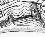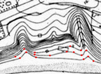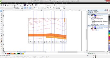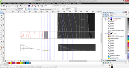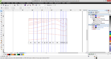 Следующим этапом раскладки рельефа является перевод полученного изображения в формат векторной графики, для этого был использован программный продукт Corel Draw. Снимок рельефа (вид сверху) импортирован на рабочую область программы, затем снимок повторяется в векторном виде, так как инструмент трассировки растрового изображения не дает необходимого результата, отрисовка рельефа проводится следующим образом: