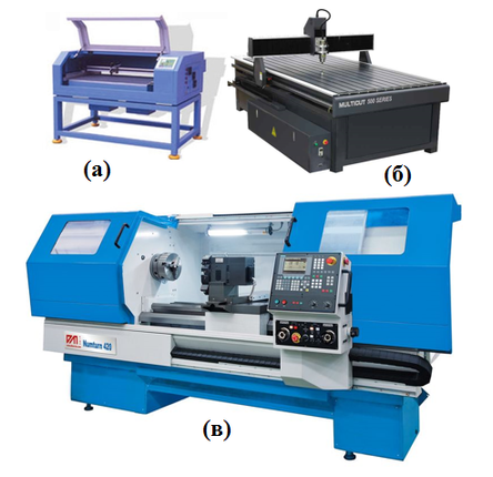 Но 3D-принтеры не единственные представители станков с ЧПУ. Существует множество различных аппаратов, представленных на рисунке 23, а, б, в таких как, твердотельные лазеры, фрезерные и токарные станки и множество других. В отечественных стандартах на станки с ЧПУ принято учитывать в обозначении станка установленный на нем вид системы ЧПУ. Станки с позиционными и прямоугольными системами управления имеют индекс «Ф2», станки с формообразующими системами – индекс «Ф3», многоцелевые (сверлильно-фрезерно-расточные) станки с контурно-позиционными системами управления – индекс «Ф4».