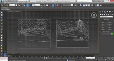 Первоначально модель рельефа построена согласно топографической карте, с помощью моделирования сплайнами, где «горячие точки» являлись узлами, затем выполнено вытягивание контура и придание толщины. После построения проведен анализ фотографий и в рельеф внесены изменения согласно известным данным. На рисунке 27 можно видеть слева топографическую карту, справа изменённый рельеф с мостовой и пирсом (вид сверху).