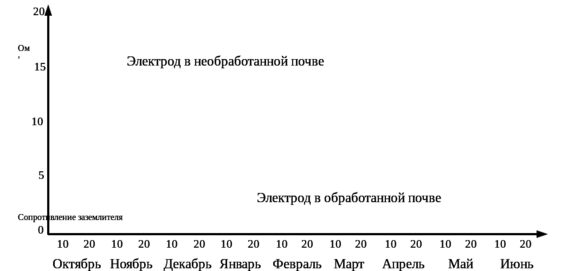 | Сопротивление одного химически – активируемого электрода D=19 мм, L= 3м, в грунтовой добавке после 1-3 месяцев, Ом. | 2 | 18 |