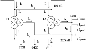 Расчет максимальных рабочих токов основных присоединений подстанции производим согласно методике, изложенной в [7]. Схема распределения токов по основным присоединениям тяговой подстанции представлена на рисунке 2.3.