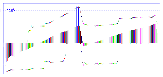 На рисунке 5.15 показана гистограмма сил в момент времени, когда головные вагоны преодолели половину пути.