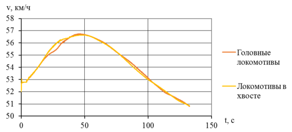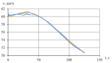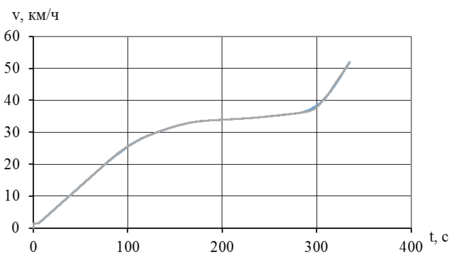 Из графика изменения скорости, рисунок 5.16, видно, что при въезде на участок со скоростью 52 км/ч в конце участка скорость падает до 51 км/ч, что является не ниже расчетной.