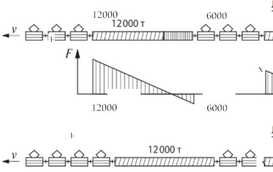 В случае, если массы объединенных поездов не равны, то при одинаковых силах тяги локомотивов в хвосте первого поезда наблюдается область сжатия вагонов, которая показана на рисунке 3.11.