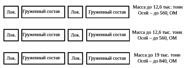 При дальнейшем увеличении массы и длины поездов до 19 000 тонн и до 840 осей целесообразно использование схем формирования поездов с расположением второго локомотива в последней трети состава по схеме ЛССЛС.