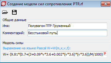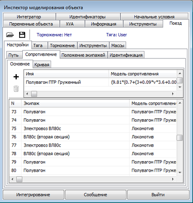 Все настройки параметров поезда расположены на вкладке Поезд в инспекторе моделирования объекта. Чтобы назначить силу сопротивления для модели поезда, требуется назначить модель локомотив для всех локомотивов. Для груженых вагонов необходимо создать модель силы сопротивления. По правилам тяговых расчетов на бесстыковом пути основное удельное сопротивление движению четырехосных вагонов на роликовых подшипниках определяют по формуле