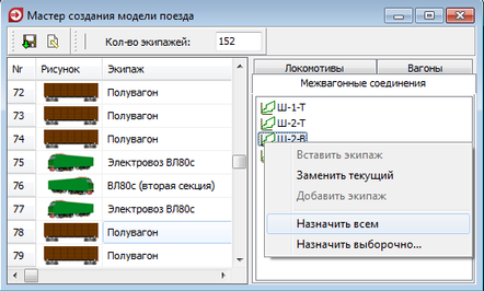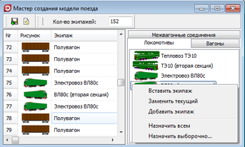 Установив необходимое количество экипажей, во вкладке Вагоны выбирается тип вагона – полувагон и назначается для всех экипажей. Затем, в соответствующие места, устанавливаются локомотивы. Для этого во вкладке Локомотивы, с помощью контекстного меню нужно выполнить команду «Заменить текущий » как показано на рисунке 4.10.
