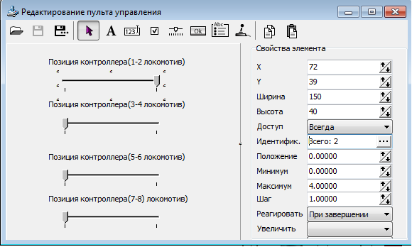 Пример пульта управления для схемы формирования поезда массой 6 300 тонн показан на рисунке 4.21. В данном примере, на каждый ползунок будет присвоено по 2 идентификатора, как показано на рисунке 4.22, т.е. на каждую секцию по одному идентификатору. Шаг ползуна = 1, минимальное значение = 0, максимальное = количеству тяговых кривых, т.е. 4.