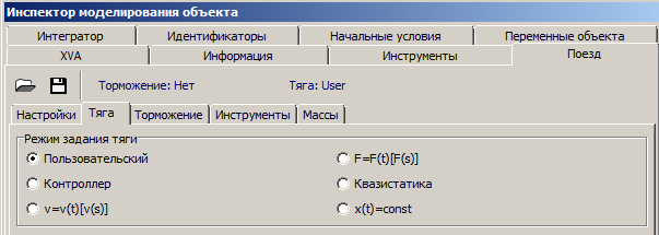 Квазистатика – режим, при котором к локомотивам прикладывается постоянная сила. Данный режим может применяться для расчета, сохранения и последующего использования начальных условий, например, с целью моделирования движения поезда из растянутого или сжатого состояния.
