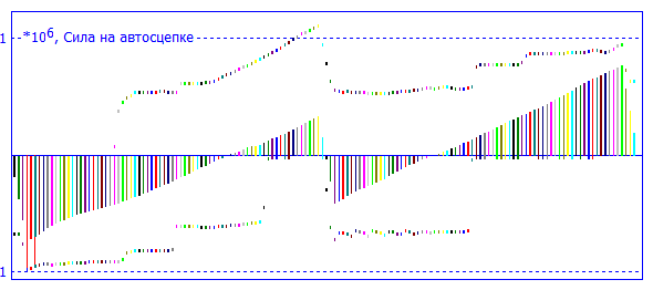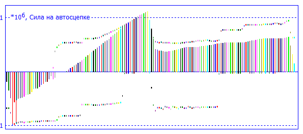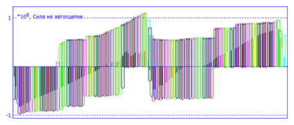 Ввиду большого количества переменных, силы показаны в виде гистограмм для большей информативности. Для каждой автосцепки показана максимальная сила, которая была зафиксирована, и сила в текущий момент времени.