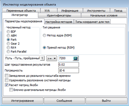 В качестве численного метода будет использован метод Парка (Park). Также необходимо включить опцию (Расчет матриц Якоби). В качестве переменной будет выступать путь – путь, пройденный с момента начала моделирования. Значение пути, которое необходимо установить в качестве переменной, берется из файла макрогеометрии, рисунок 4.27 и равно 7200.