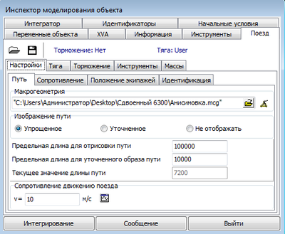 Коэффициент использования сцепного веса задается в модели идентификатором adhesive_weight_factor. Коэффициент сцепления задается коэффициентом трения между колесом и рельсом при создании модели пути, в редакторе макрогеометрии. По умолчанию коэффициент трения равен 0, 25. Масса экипажа задается обязательным идентификатором Mass.