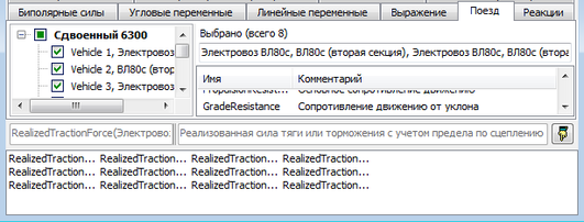 Таким же образом, добавляются переменные реализованной силы тяги для всех локомотивов, рисунок 4.24 и переменные изменения скорости движения.