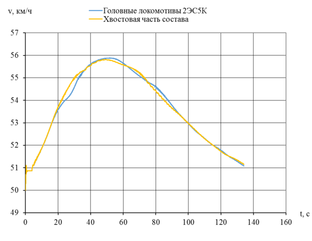 На рисунке 5.9 показан график изменения скорости поезда в головной и хвостовой части. Максимальная скорость достигла 55,9 км/ч в головной части состава на отметке 2700 км участка Анисимовка – тоннель. В конце участка скорость упала до 51 км/ч. Таким образом, скорость поезда не падает ниже расчетной.