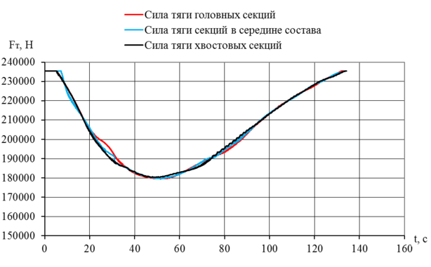 Максимальная сила тяги, реализованная с учетом предела по сцеплению, равна 235,5 кН, для каждой секции, на максимальной (4) позиции контроллера машиниста. График изменения реализованной силы тяги представлен на рисунке 5.5.