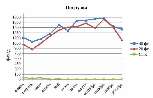 Рис. 3.5. Динамика погрузки контейнерного терминала ст. Хабаровск 2: – 40-фт. конт.; – 20-фт. конт.; – СТК