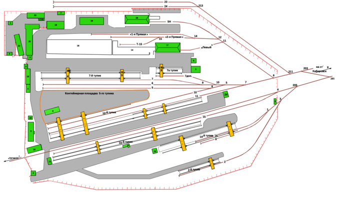 1 - склад электрооборудования, 2 - контрольно-пропускной пункт, 3 - помещение МКБ контейнерного участка, 4 - помещение весоповерочного участка, 5 - здание дежурного по дистанции, 6 - склад реализации, 7 - склад горюче-смазочных материалов, 8 - площадка осмотра контейнеров, 9 - здание контейнерного отделения, 10 - таможенный склад, 11 - здание таможни, 12 - здание приемосдатчиков, 13 - помещение приемосдатчиков , 14 - рампа склада, 15 - склад ангарного типа №1, 16 - склад временного хранения «Первой прямой», 17- склад ангарного типа №2, 18 - контейнерная площадка, 19 - склад металлический, 20 - гараж, 21 - мастерские, 22 - административно-бытовой корпус, 23 - склад товарно-материальных ценностей, 24 - подстанция