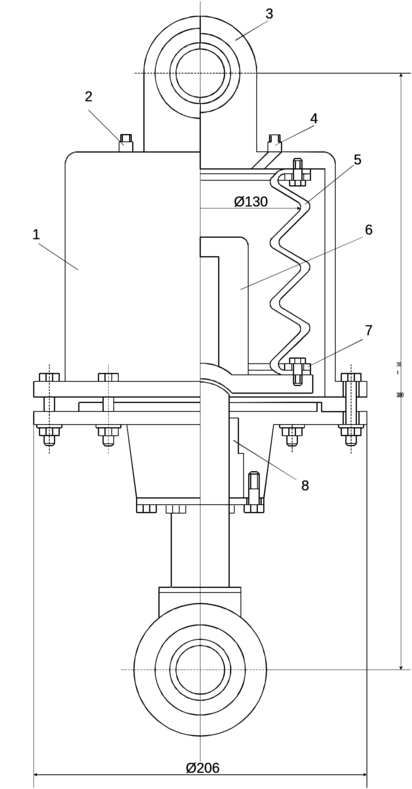 Рисунок 3.12 – Пневматический гаситель колебаний: 1 – литой корпус; 2 – соединение с главным резервуаром; 3 – верхняя головка; 4 – соединение с резервуаром; 5 – полиуретановый сильфон; 6 – полиуретановый отбойник; 7 – прижимной фланец; 8 – сальник.