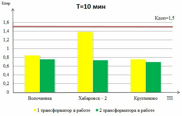 Рассмотрим показатели нагрузочной способности трансформаторов. На рисунке 6.3 приведены коэффициенты перегрузок тяговых трансформаторов за 10 минут при одном и двух работающих трансформаторах на ТП Хабаровск - 2.