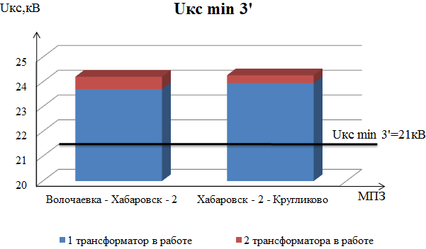 Как видно из рисунка 6.2, повышение напряжения при параллельной работе двух трансформаторов незначительное. Уровень напряжения поднялся на 500 В для МПЗ Волочаевка – Хабаровск-2 и на 320 В для МПЗ Хабаровск-2 - Кругликово.