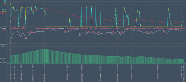 Рисунок 1.8 – Потребление токовых нагрузок поездом массой 12476т при движении по участку Карьерный - Ядрин в четном направлении
