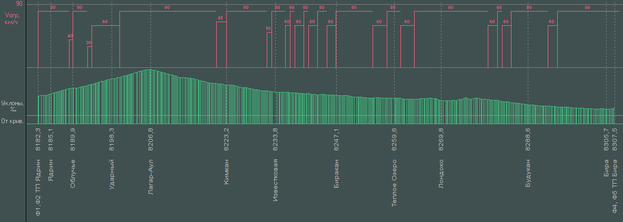 Анализируя данные участки и кривую тока, потребляемую поездом, можно сказать что на участке Карьерный – Ядрин имеются несколько уклонов, которые оказывают существенное сопротивление движению тяжеловесного поезда в четном направлении, в следствии чего поездом потребляются продолжительные токовые нагрузки.