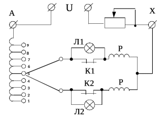 б) собрать схему, приведенную на рис. 9.1, т.е. подвести питание на выводы обмотки ВН, подключить параллельно нормально закрытому контакту контактора сигнальные лампы напряжением 12 - 24 В и закоротить выводы обмотки НН;