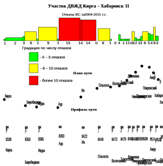 Профиль участка Кирга –Хабаровск-II преимущественно равнинный (рисунок 1.3). Наиболее сложным участком, с точки зрения профиля пути, является перегон Кирга – Биробиджан-I, участков же с малыми радиусами кривых здесь нет. Несмотря на данные факторы перегон Кирга –Биробиджан-I не имеет наибольшее число отказов среди всех рассмотренных участков. Наибольшее количество отказов, за рассмотренный период произошло на участке Аур –Ольгохта. Подавляющее большинство отказов на этом участке связано с отказом струн (50%), что может быть вызвано сложными климатическими условиями работы, в частности повышенным ветром в условиях равнинной местности, либо нарушением технологии работ, эксплуатирующим данный участок контактной сети подразделением ЭЧ-2.