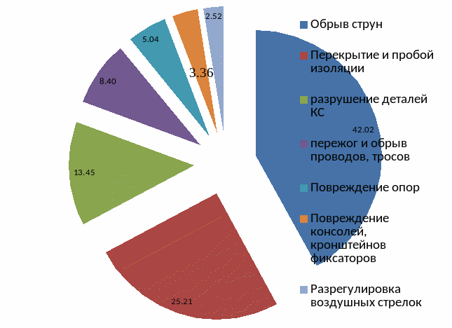 Основной причиной отказов устройств контактной сети участка ЭЧ-2 ст. Кирга – ст. Хабаровск-II является обрыв струн - в рассмотренные годы почти половина от общего числа отказов (42%) (рисунок 1.2). Согласно отчетам об отказах устройств контактной сети, данные отказы вызваны пережогом струн либо разрушением в месте сочлененья звеньев струны в результате электромеханического воздействия (износ).