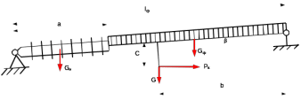 где a - длина изолятора, м;lф - длина фиксатора, м; Pk -усилие, создаваемое контактным проводом, H; c - высота фиксаторной стойки, м; b -расстояние он фиксаторной стойки до точки крепления основного стержня фиксатора струнами, м; G, Gф и Gи - вес дополнительного стержня фиксатора и части контактного провода, основного стержня фиксатора и изолятора соответственно, H; β - угол подъема основного стержня фиксатора, град.