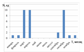 Судя по рисунку 4.3, наибольшее число отказов приходится на такие месяцы как март, апрель и октябрь. Март и апрель характерны появлением в сутках первых положительных температур, как и октябрь – отрицательных. Данный переход не происходит скачком, а занимает определенный временной период, в который дневная температура несколько раз в сутки меняет свой знак.