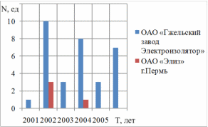 Таблица 4.1 – Статистика о нарушении работы изоляторов по годам изготовления и заводу-изготовителю
