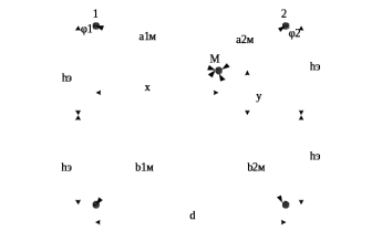 Расчет напряженности электрического поля выполняется для двух точек, одна из которых находится на уровне головы человека, стоящего на земле, рост человека составляет 1,8 м, другая - находится на уровне головы человека, работающего под напряжением с изолированной вышки на высоте 6,25 м от земли. Расчетные точки перемещаются поперек осей двух путей в пределах x=0÷8м от оси первого пути. Схема для расчета напряженности электрического поля контактной сети двухпутного участка представлена на рисунке 7.1.