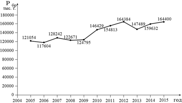 На рисунке 2.1 изображен график изменения объема грузовых перевозок грузов ДВЖД за отрезок времени 2005 – 2015 гг.