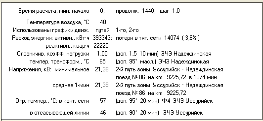 В результате расчета по графику движения, единственным ограничивающим параметром участка Уссурийск – Надеждинская является уровень напряжения на токоприемнике электровоза: 20,9 кВ при минимально-допустимом уровне напряжения в 21 кВ.