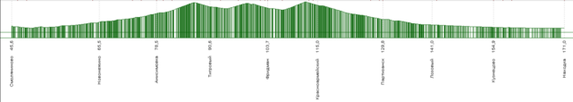 Практически всю длину участка занимают два протяженных подъема, образующих возвышенность. Это делает профиль рассматриваемого участка крайне сложным и оказывает негативное влияние на пропускную способность участка.
