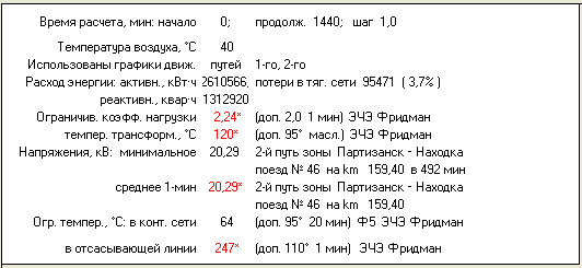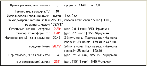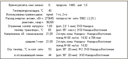 В результате расчета по графику движения, ограничивающими параметрами участка Находка – Находка Восточная является уровень напряжения на токоприемнике электровоза: 19,4 кВ при минимально-допустимом уровне в 21 кВ и коэффициент нагрузки тяговых трансформаторов 2,4 при максимально-допустимом значении 2.
