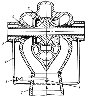 1 – отводная трубка; 2 – корпус всасывающего патрубка; 3 – клапан; 4 – байпас; 5 – торцевое уплотнение; 6 – уплотнение; 7 – полости всасывания колеса.