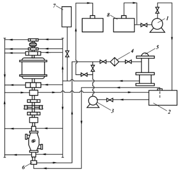 1 – шестеренчатый насос; 2 – маслобак; 3 – шестеренчатый насос; 4 – фильтр; 5 – маслоохладитель; 6 – основной насос; 7 – аккумулирующий бак; 8 – емкость.