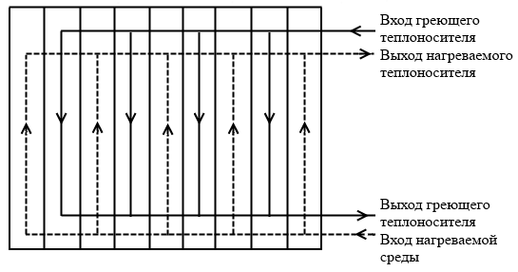 Полученное соотношение ходов не превышает 2, значит для повышения скорости среды и, следовательно, для эффективного теплообмена целесообразна симметричная компоновка. Схема представлена на рисунке 3.3.
