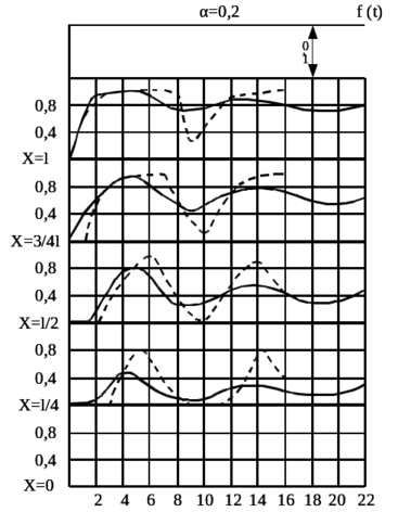 Им были найдены общие закономерности волнового характера распространения возмущений вдоль поезда. Лазарян предложил рассматривать состав как упруговязкий стержень или как упругий стержень с гистерезисом, для учета диссипативных составляющих системы и оценке сопротивлений, обусловленных взаимными перемещениями вагонов. Используя метод Фурье, он вывел формулу, которая позволила получить график изменения продольных усилий в четырех сечениях поезда, представленный на рисунке 1.2.