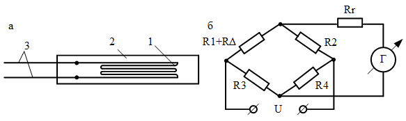 Рисунок 1.6 – Проволочный тензорезистор (а) и схема его включения (б):