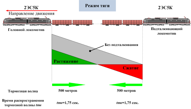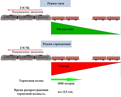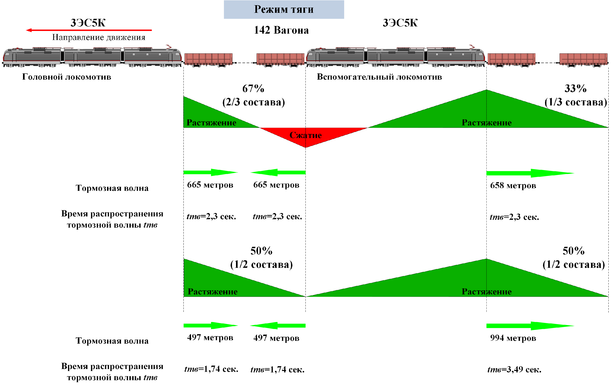 Такая задержка во времени падения и повышения давления в тормозных цилиндрах первого и последнего вагонов, вызывает значительные динамические усилия по всей длине поезда. Возникает потребность в формировании составов с распределенными по длине тяговыми единицами.